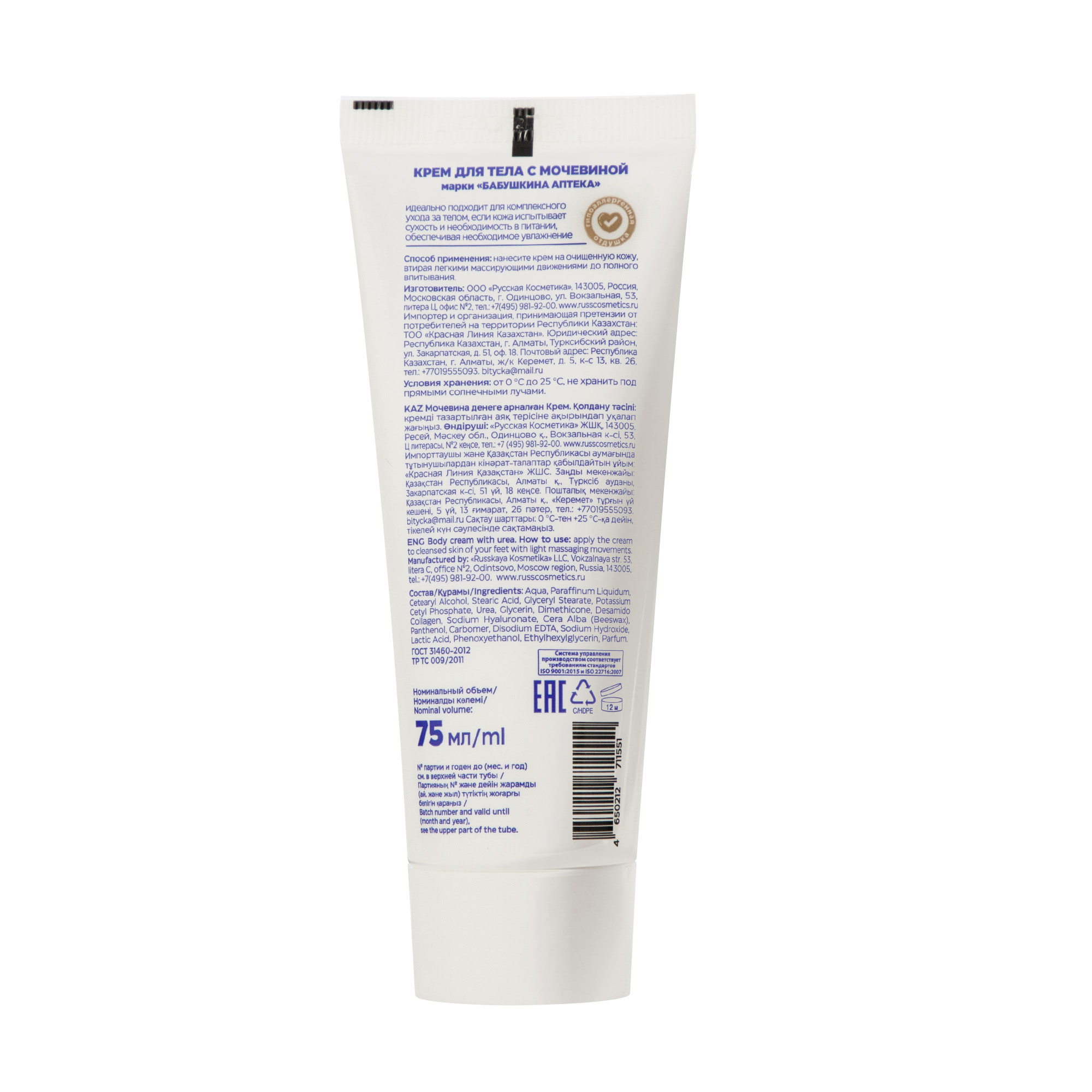 Aqua, Paraffinum Liquidum, Сetearyl Alcohol, Stearic Acid, Glyceryl Stearate, Potassium Cetyl Phosphate, Urea, Glycerin, Dimethicone, Desamido Collagen, Sodium Hyaluronate, Cera Alba (Beeswax), Panthenol, Carbomer, Disodium EDTA, Sodium Hydroxide, Lactic Acid, Phenoxyethanol, Ethylhexylglycerin, Parfum.