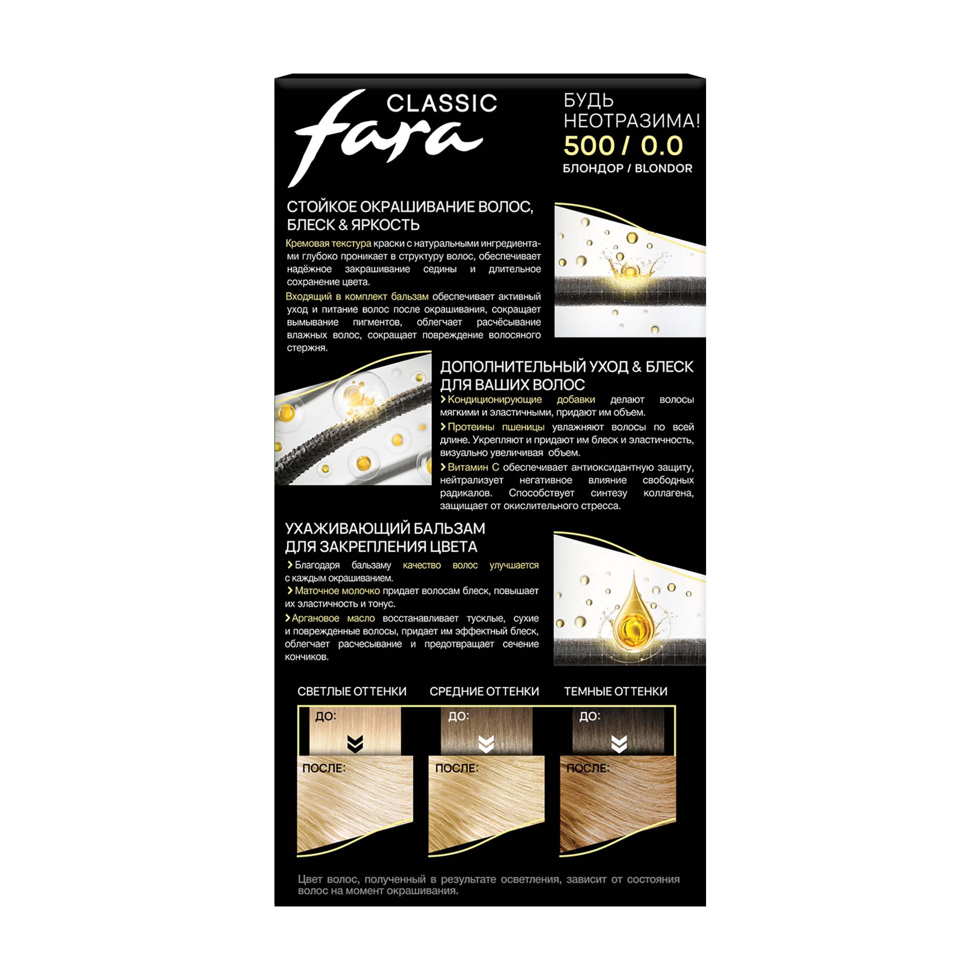 Стойкая крем-краска для волос Fara Classic 500 Блондор осветляет на 2-3 тона, не сдержит окрашивающих пигментов и придает волосам стойкий насыщенный цвет.