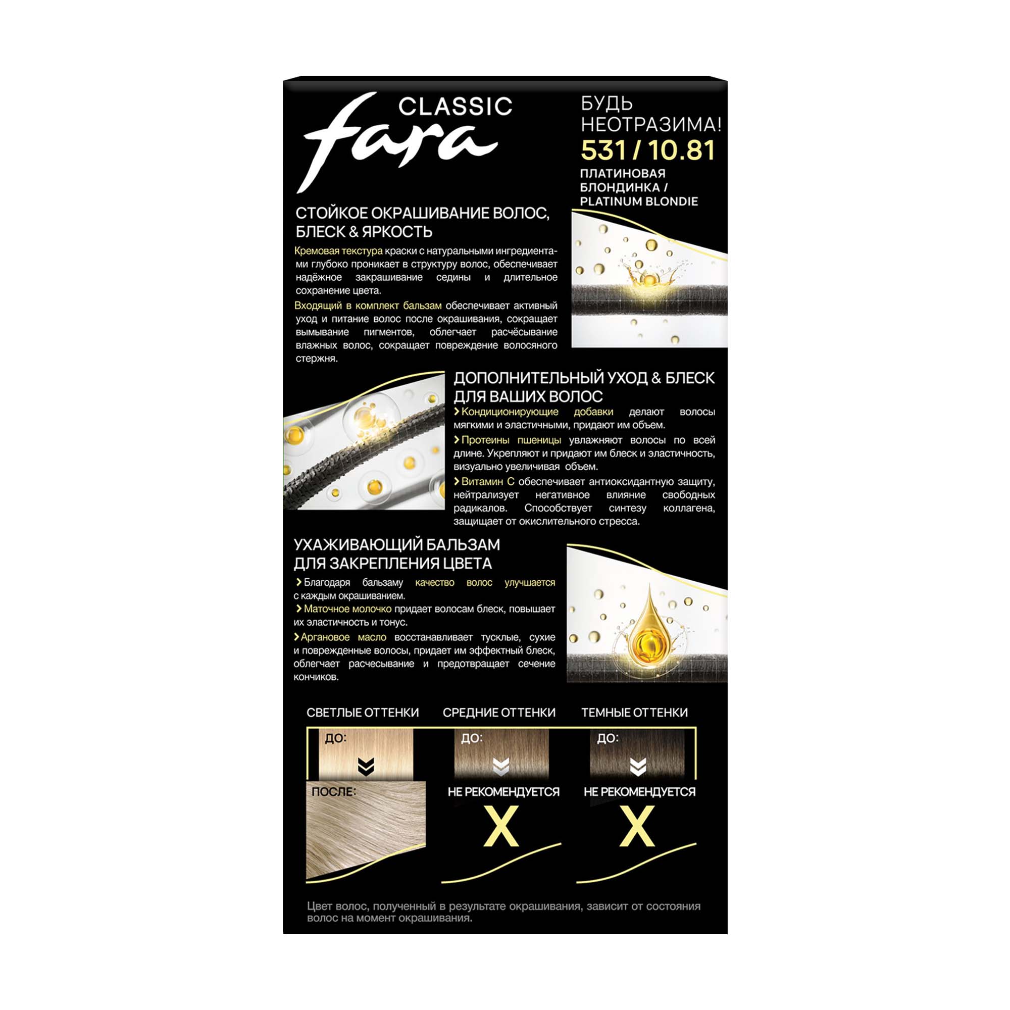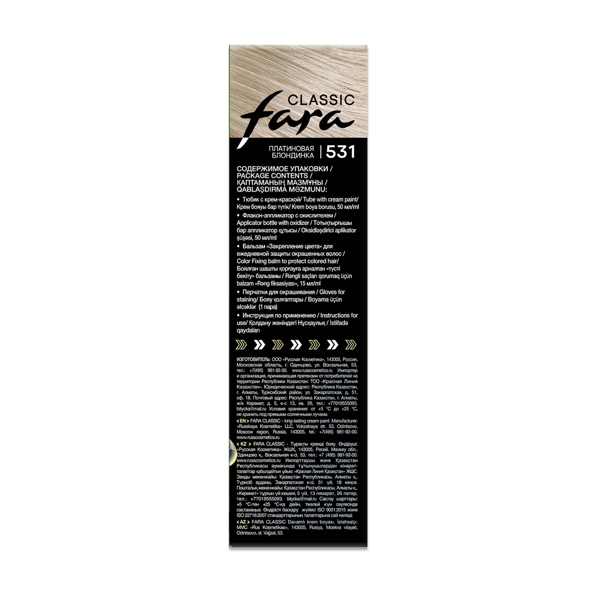 Крем-краска для волос Fara Classic 531 Платиновая блондинка мягко окрашивает, придавая волосам стойкий насыщенный цвет.