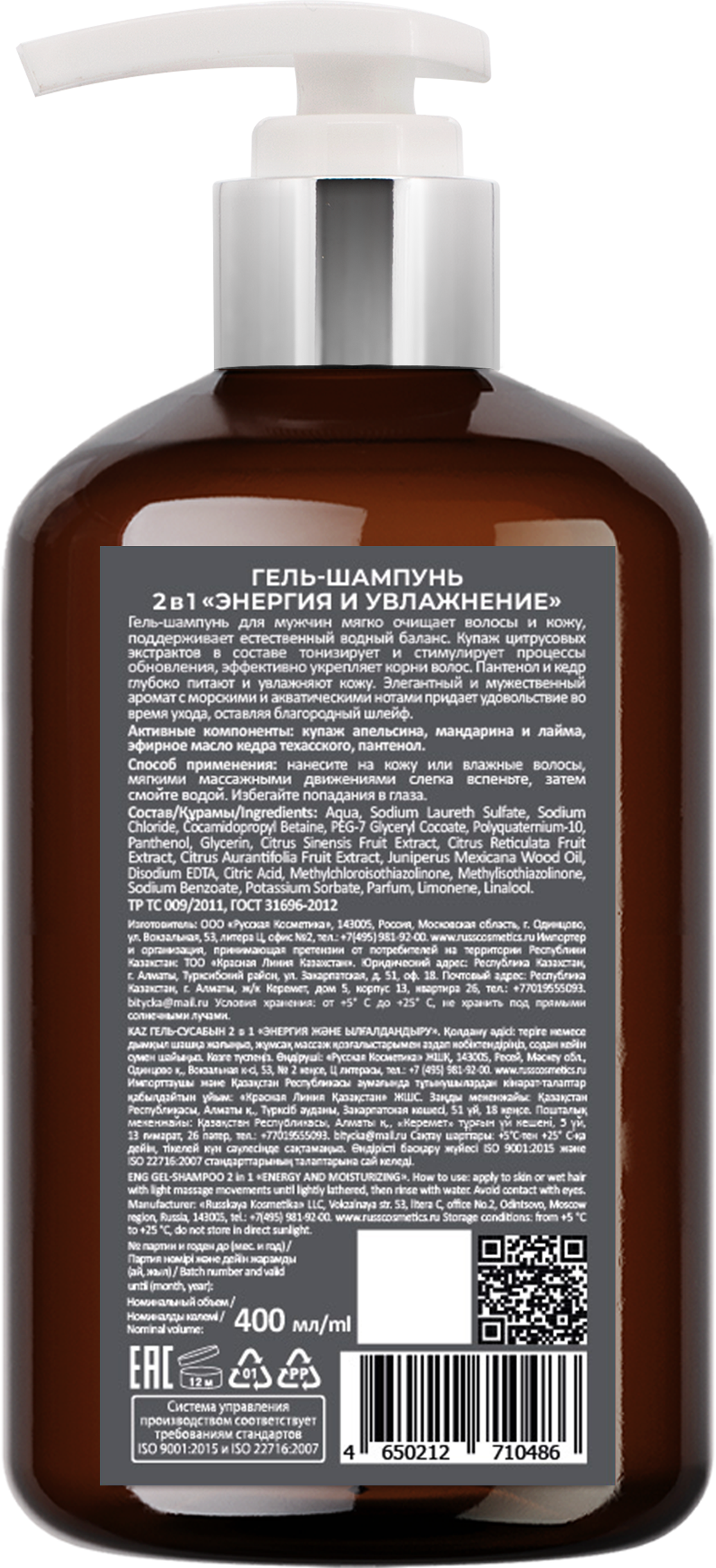 Aqua, Sodium Laureth Sulfate, Sodium Chloride, Cocamidopropyl Betaine, PEG-7 Glyceryl Cocoate, Polyquaternium-10, Panthenol, Glycerin, Citrus Sinensis Fruit Extract, Citrus Reticulata Fruit Extract, Citrus Aurantifolia Fruit Extract, Juniperus Мexicana Wood Oil, Disodium EDTA, Citric Acid, Methylchloroisothiazolinone, Methylisothiazolinone, Sodium Benzoate, Potassium Sorbate, Parfum, Limonene, Linalool. ТР ТС 009/2011, ГОСТ 31696-2012