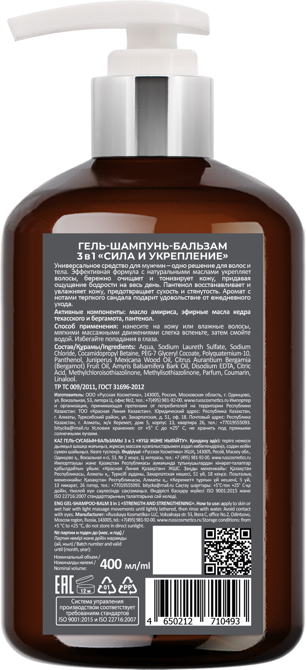 Aqua, Sodium Laureth Sulfate, Sodium Chloride, Cocamidopropyl Betaine, PEG-7 Glyceryl Cocoate, Polyquaternium-10, Panthenol, Juniperus Мexicana Wood Oil, Citrus Aurantium Bergamia (Bergamot) Fruit Oil, Amyris Balsamifera Bark Oil, Disodium EDTA, Citric Acid, Methylchloroisothiazolinone, Methylisothiazolinone, Parfum, Coumarin, Linalool. ТР ТС 009/2011, ГОСТ 31696-2012