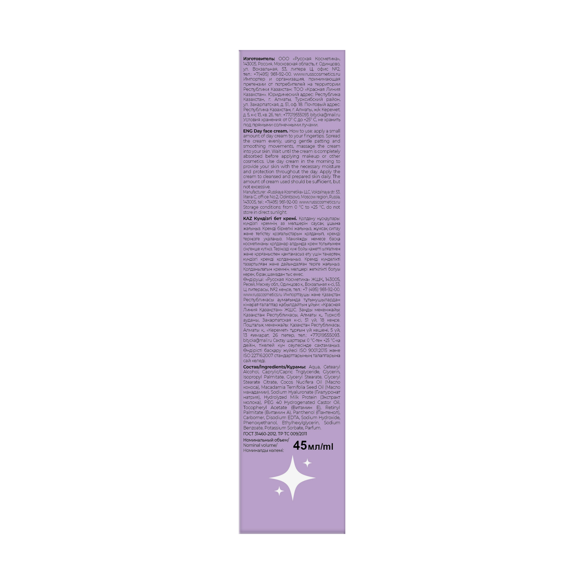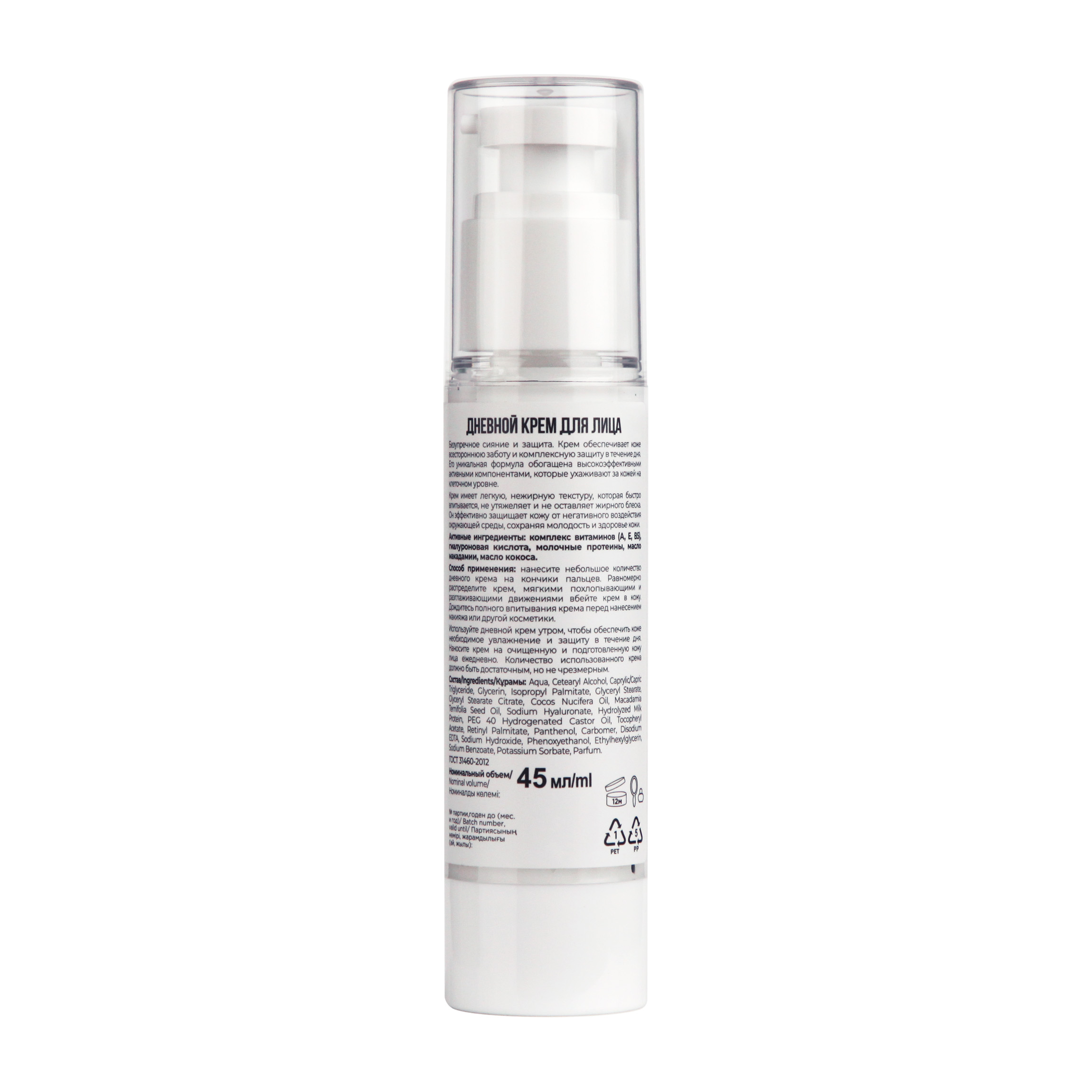 Aqua, Cetearyl Alcohol, Caprylic/Capric Triglyceride, Glycerin, Isopropyl Palmitate, Glyceryl Stearate, Glyceryl Stearate Citrate, Cocos Nucifera Oil (Масло кокоса), Macadamia Ternifolia Seed Oil (Масло макадамии), Sodium Hyaluronate (Гиалуронат натрия), Hydrolyzed Milk Protein (Экстракт молока), PEG 40 Hydrogenated Castor Oil, Tocopheryl Acetate (Витамин Е), Retinyl Palmitate (Витамин А), Panthenol (Пантенол), Carbomer, Disodium EDTA, Sodium Hydroxide, Phenoxyethanol, Ethylhexylglycerin, Sodium Benzoate, Potassium Sorbate, Parfum.