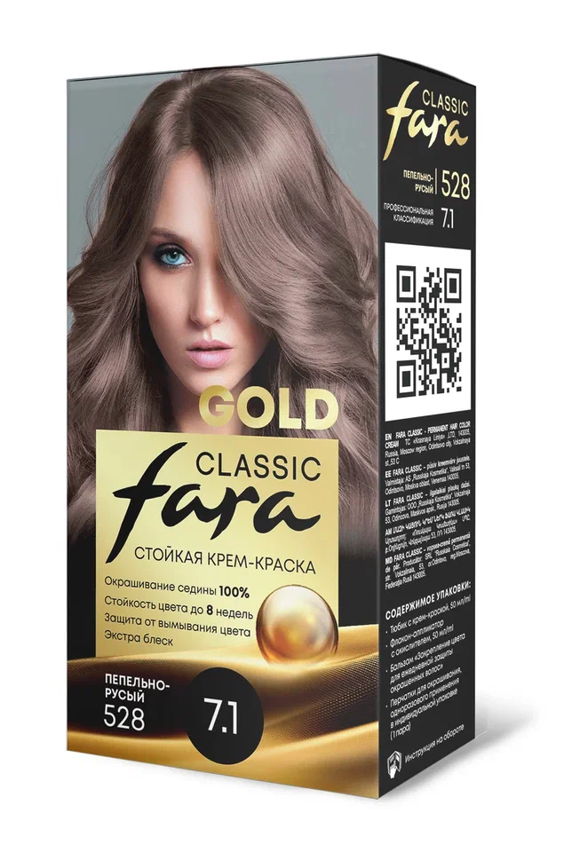 Стойкая крем-краска для волос Fara Classic Gold 528 Пепельно-русый - 7.1 - это 100% профессиональное закрашивание седины и стойкость цвета до 8 недель.