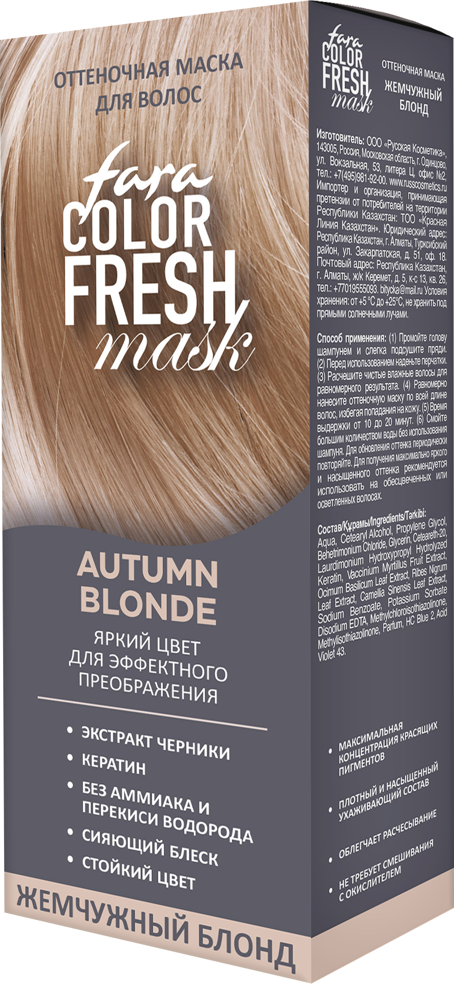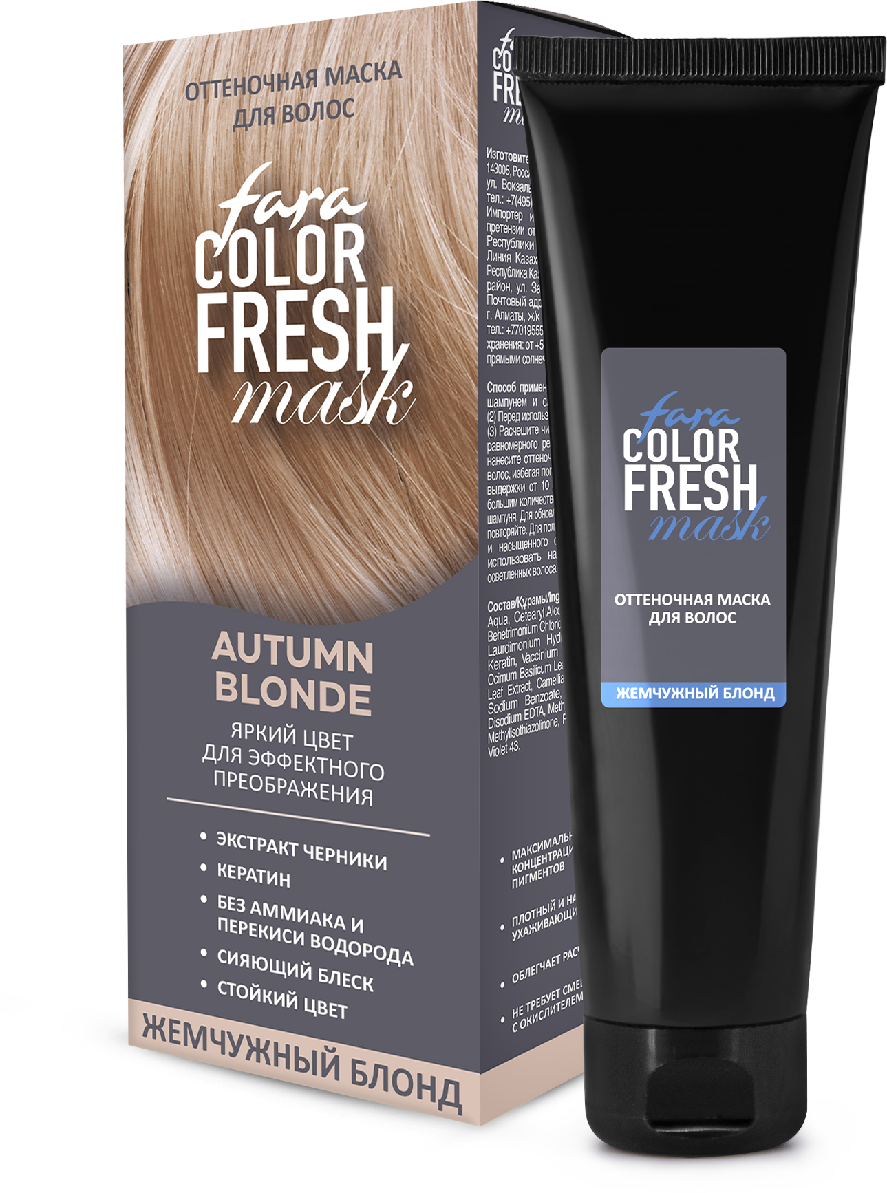 Оттеночная маска для волос профессионального уровня Color Fresh марки Fara с максимально высоким содержанием ухаживающих компонентов*. Тонирует и освежает цвет окрашенных волос, насыщая оттенок ледяными серебристо-пепельными переливами, выгодно подчеркивая структуру прядей. Для получения максимально яркого и насыщенного оттенка рекомендуется использовать на обесцвеченных или осветленных волосах.