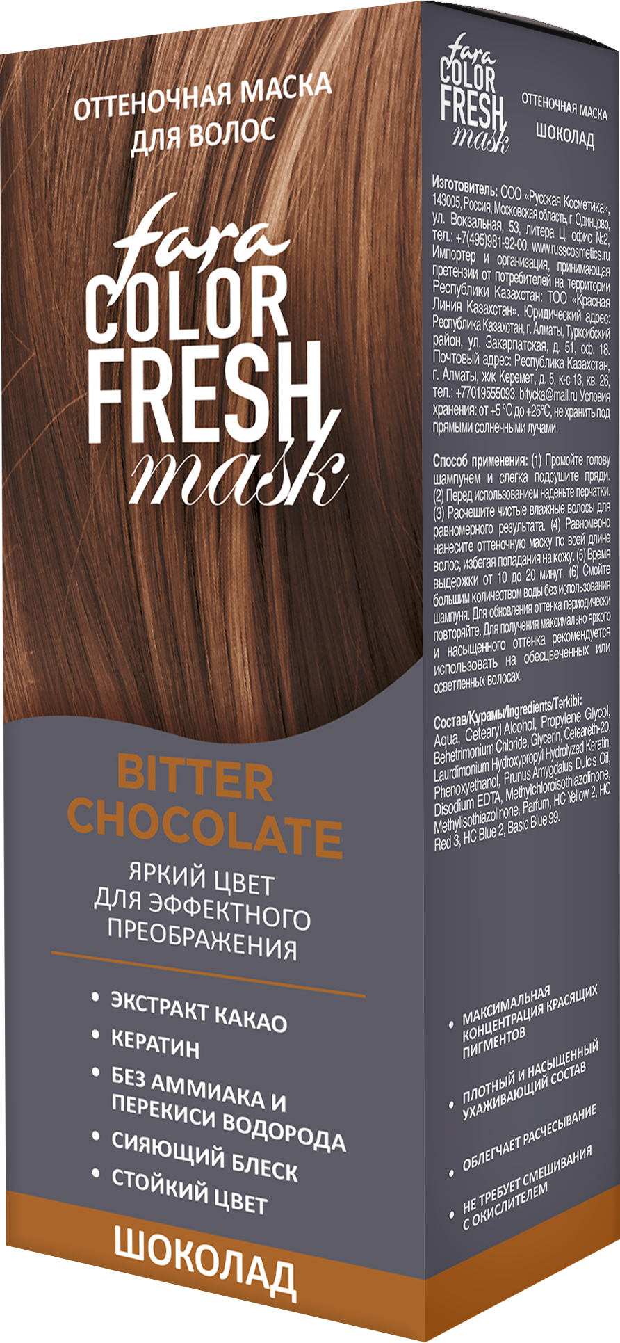 Оттеночная маска для волос профессионального уровня Color Fresh марки Fara с максимально высоким содержанием ухаживающих компонентов*. Придаёт волосам глубокий и насыщенный шоколадный оттенок - глубокий, переливающийся на солнце, многогранный и выразительный! Цвет вне времени и моды.