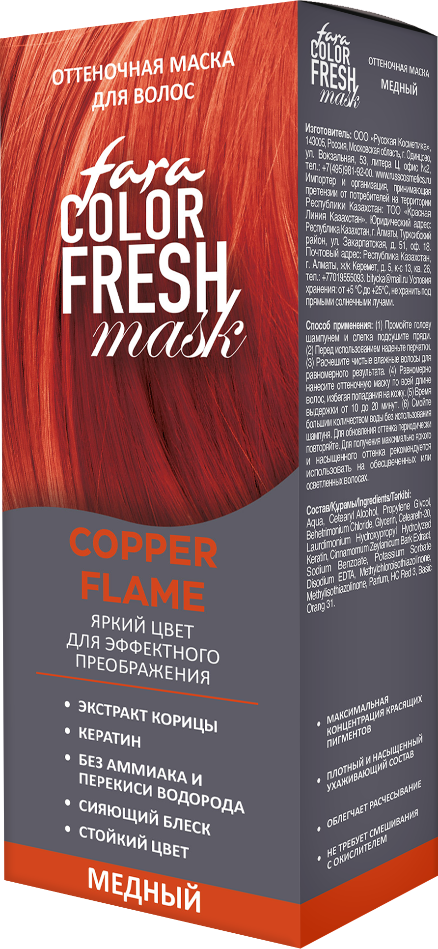 Оттеночная маска для волос профессионального уровня Color Fresh марки Fara с максимально высоким содержанием ухаживающих компонентов*. Тонирует волосы в красно-розовые тона с золотистым отливом, придавая естественный рыжий цвет, который подходит большинству женщин. Для получения максимально яркого и насыщенного оттенка рекомендуется использовать на обесцвеченных или осветленных волосах.