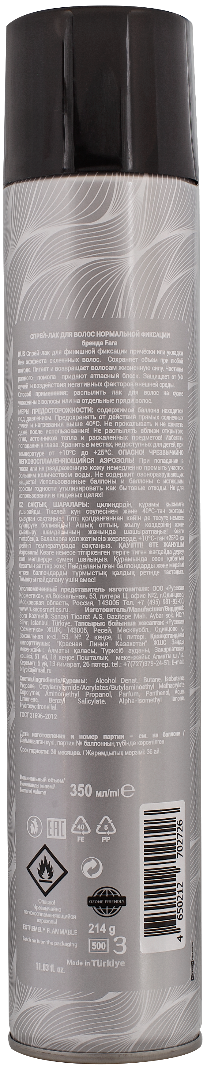 Спрей-лак для финишной фиксации причёски или укладки без эффекта склеенных волос. Сохраняет объем при любой погоде. Питает и возвращает волосам жизненную силу. Частицы разного помола придают атласный блеск. Защищает от УФ лучей и воздействия негативных факторов внешней среды.