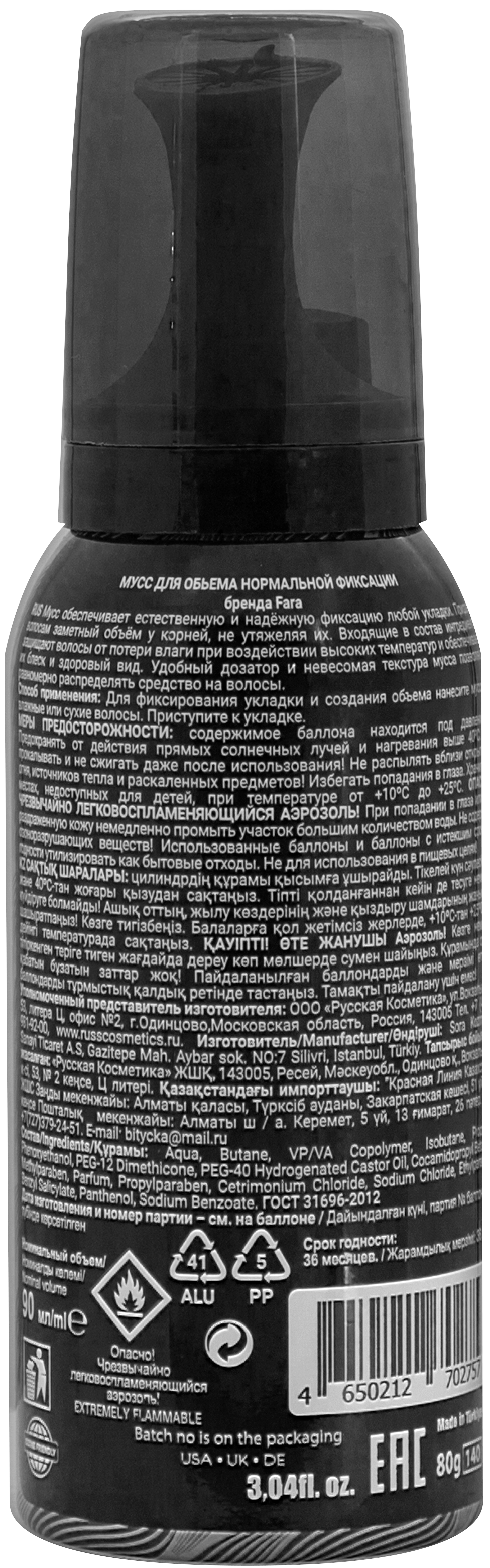 Aqua, Butane, VP/VA Copolymer, Isobutane, Propane, Phenoxyethanol, PEG-12 Dimethicone, PEG-40 Hydrogenated Castor Oil, Cocamidopropyl Betaine, Methylparaben, Parfum, Propylparaben, Cetrimonium Chloride, Sodium Chloride, Ethylparaben, Benzyl Salicylate, Panthenol, Sodium Benzoate. ГОСТ 31696-2012