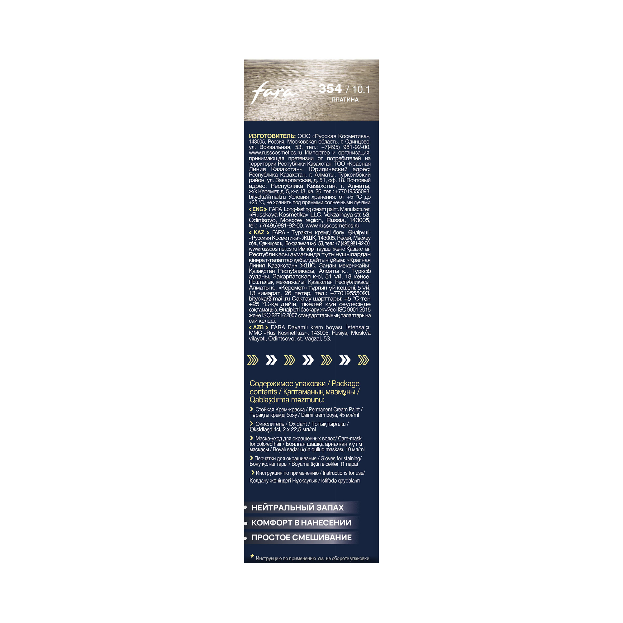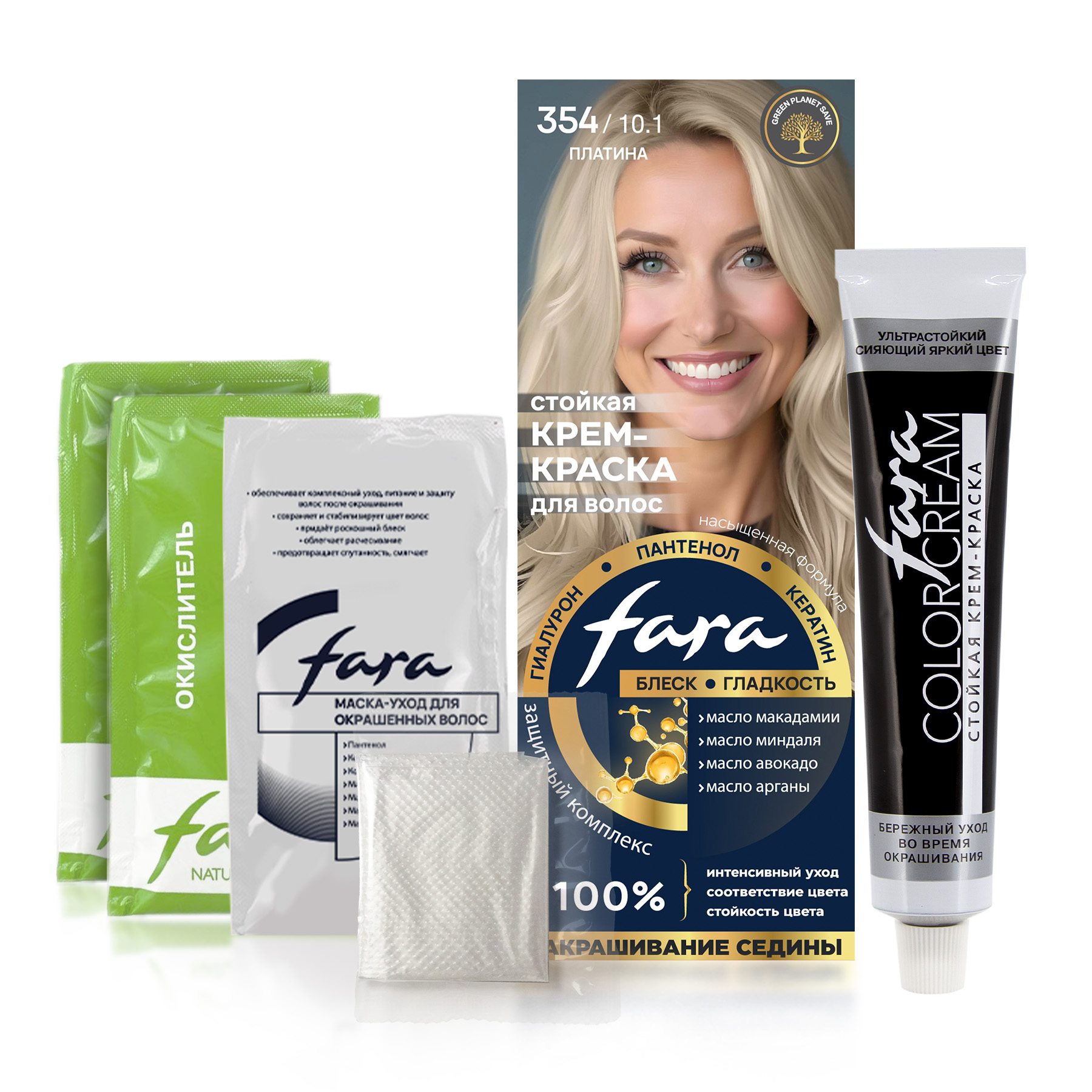 Специальная формула крем-краски Fara тон «Платина» 354 способствует глубокому проникновению красителя и повышает его устойчивость на 30%.