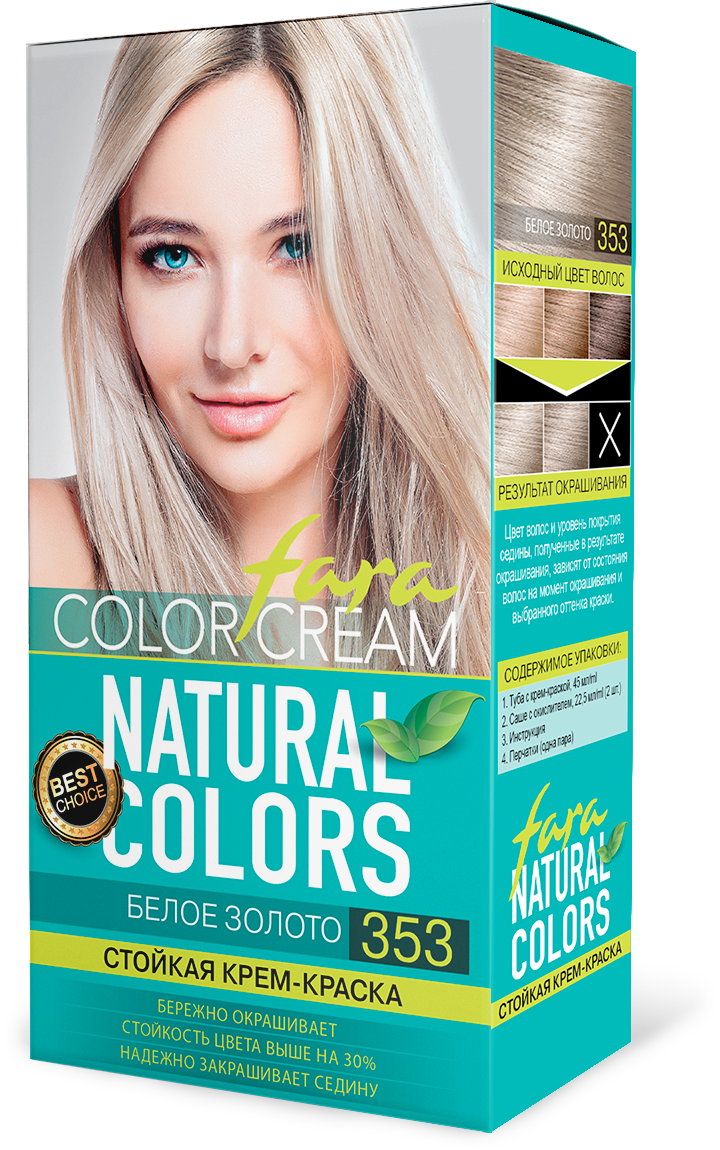 Специальная формула крем-краски Fara Natural 353 Белое золото способствует более глубокому проникновению красителя в стержень волоса, делает оттенок более интенсивным и повышает его устойчивость на 30%.Результат окрашивания: