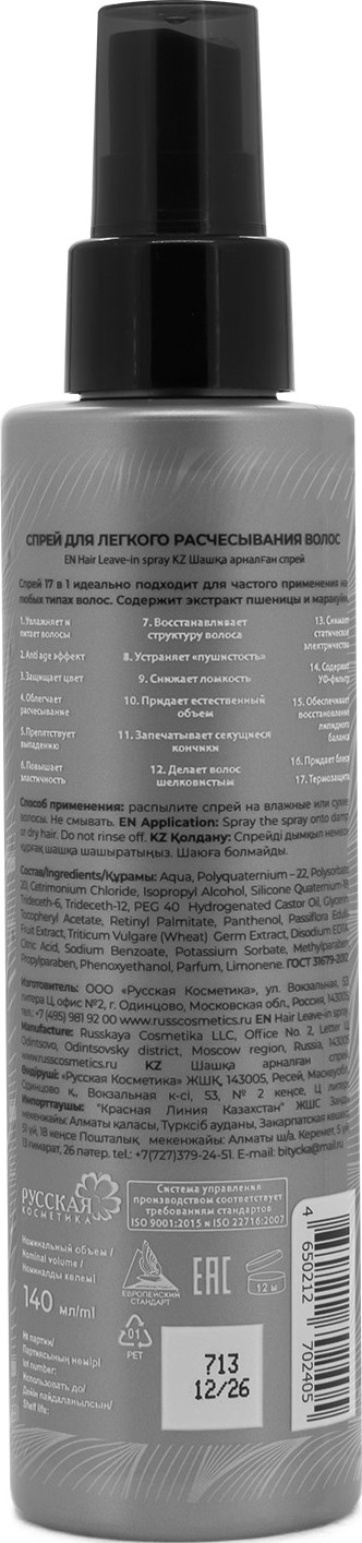 Спрей 17 в 1 идеально подходит для частого применения на любых типах волос. Содержит Экстракт пшеницы и маракуйи. Поддерживает естественный гидробаланс волос, повышается упругость и эластичность. Разглаживает поверхность волоса и придает шелковистость. Спрей не утяжеляет волосы и убирает статическое электричество и пушистость. Спрей можно использовать на влажные или сухие волосы. Помогает избежать спутанности волос. Защита от термовоздействия.