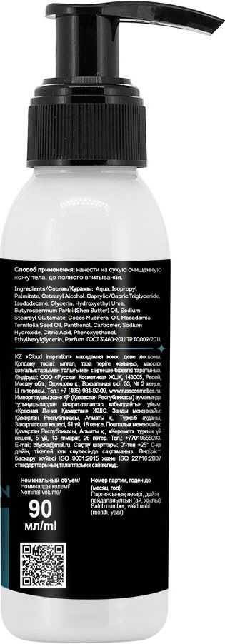 Лосьон "Сloud inspiration" разработан специально для увлажнения и питания кожи рук и тела. В основе лосьона натуральные компоненты, которые повышают тонус, способствуют восстановлению и удержанию влаги в клетках кожи. Масло кокоса глубоко питает и насыщает кожу полезными веществами. Масло макадамии смягчает кожу, устраняет шелушение и раздражение, делает кожу более мягкой и нежной. Пантенол стимулирует восстановление целостности кожных покровов, устраняет ощущение стянутости и шелушение. Нежный аромат кокоса обволакивает тело и дарит ощущение райского наслаждения.
