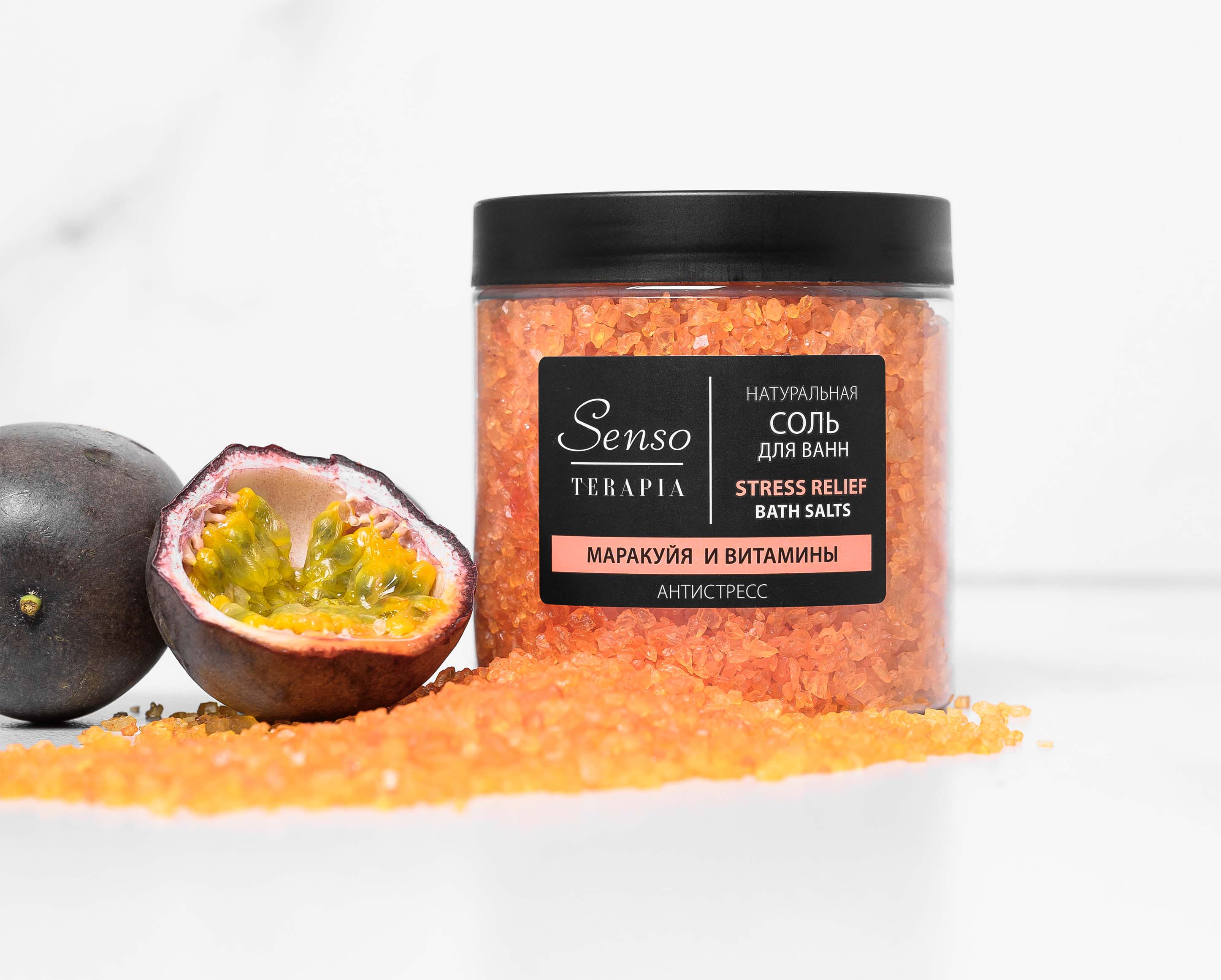 - Натуральная соль, обогащенная экстрактом маракуйи и витаминами, устраняет усталость в мышцах и плечах, способствует расслаблению и успокоению.